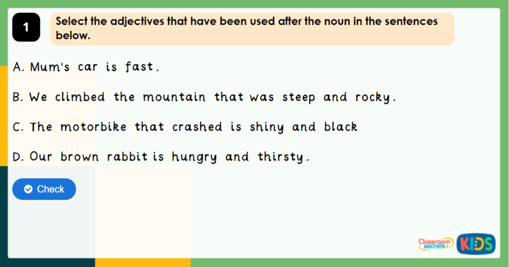 Play this Year 2 Adjectives After the Noun Game to practise recognising adjectives written after a noun. There are five questions for you to answer. How many will you complete correctly?