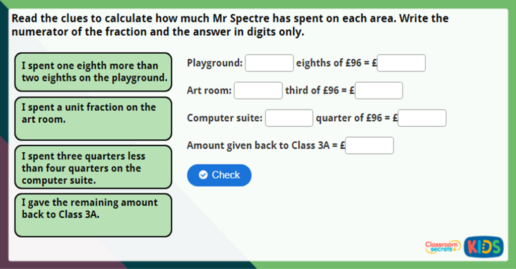 Play this Year 3 Fractions of an Amount 3 Maths Challenge and put your knowledge of finding unit and non-unit fractions of an amount to the ultimate test! Help Mr Spectre to work out how much was spent on each area of the school! How long will it take you to solve the challenge?