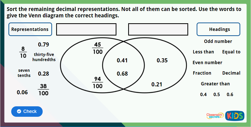 Play this Year 4 Hundredths as Decimals Maths Challenge and put your knowledge of writing hundredths as decimals to the ultimate test! Help Sol and Leo to complete the missing representations and headings on the Venn Diagram.