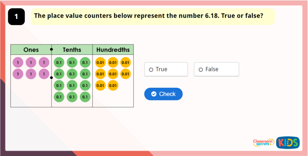 These Decimals up to 2 Decimal Places Year 5 Lesson Slides will teach you the skills you need to read, write and recognise decimal numbers up to 2 decimal places. Press the audio button on each slide to hear the teacher’s explanation. How many questions can you answer correctly?