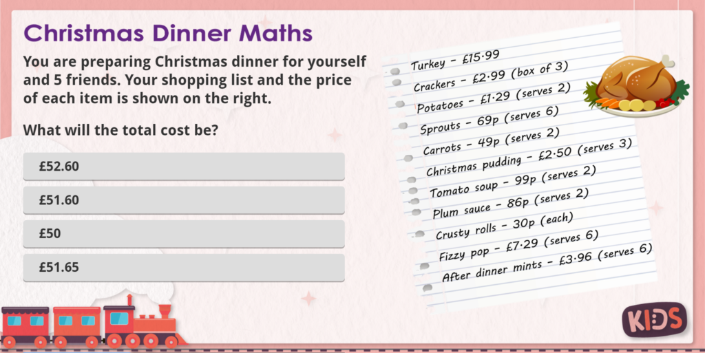 Use the shopping list to work out how much you need to spend to make a Christmas dinner and how much it will cost per person in this Year 5 Christmas Dinner Maths activity.