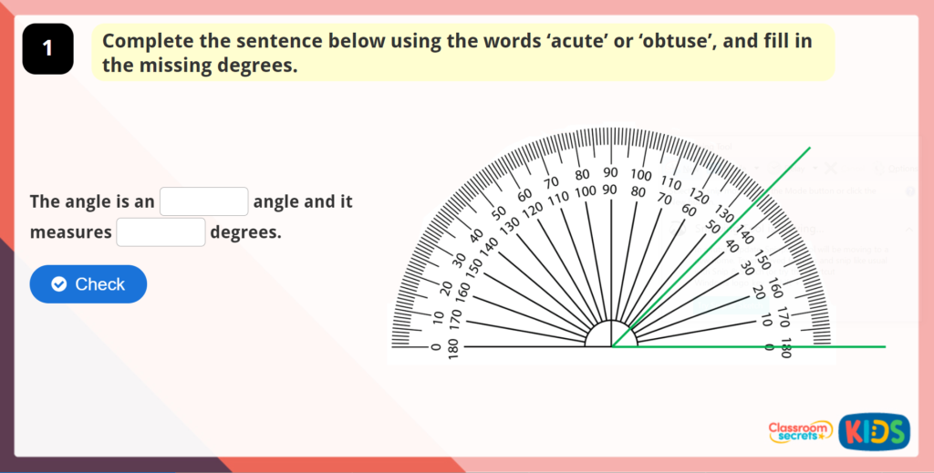 Play this Year 5 Measure with a Protractor Game and see how well you can measure angles with a protractor! There are five questions for you to answer - how many of them will you answer correctly?
