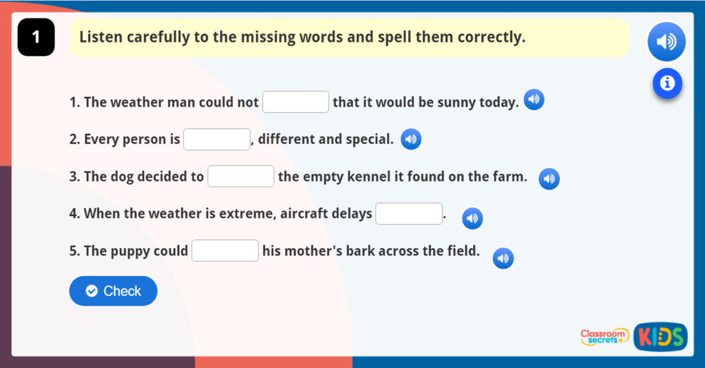 Try this Year 5 and 6 Spelling Activity 9. Listen carefully to the words in the sentences. How many of them can you spell correctly?