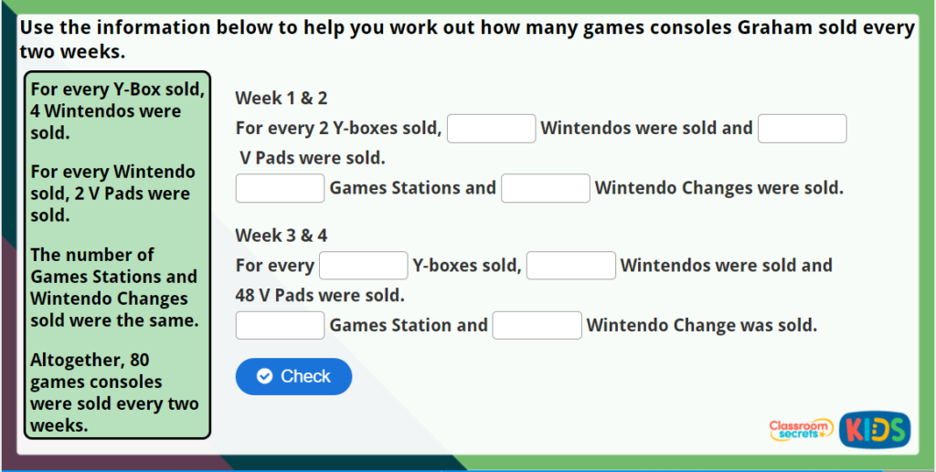 Play this Year 6 Using Ratio Language Maths Challenge and put your knowledge of using ratio language to compare two or more quantities to the ultimate test! Use the clues given to help Graham identify the missing numbers and work out how many games consoles he sold. How long will it take you to complete the challenge?